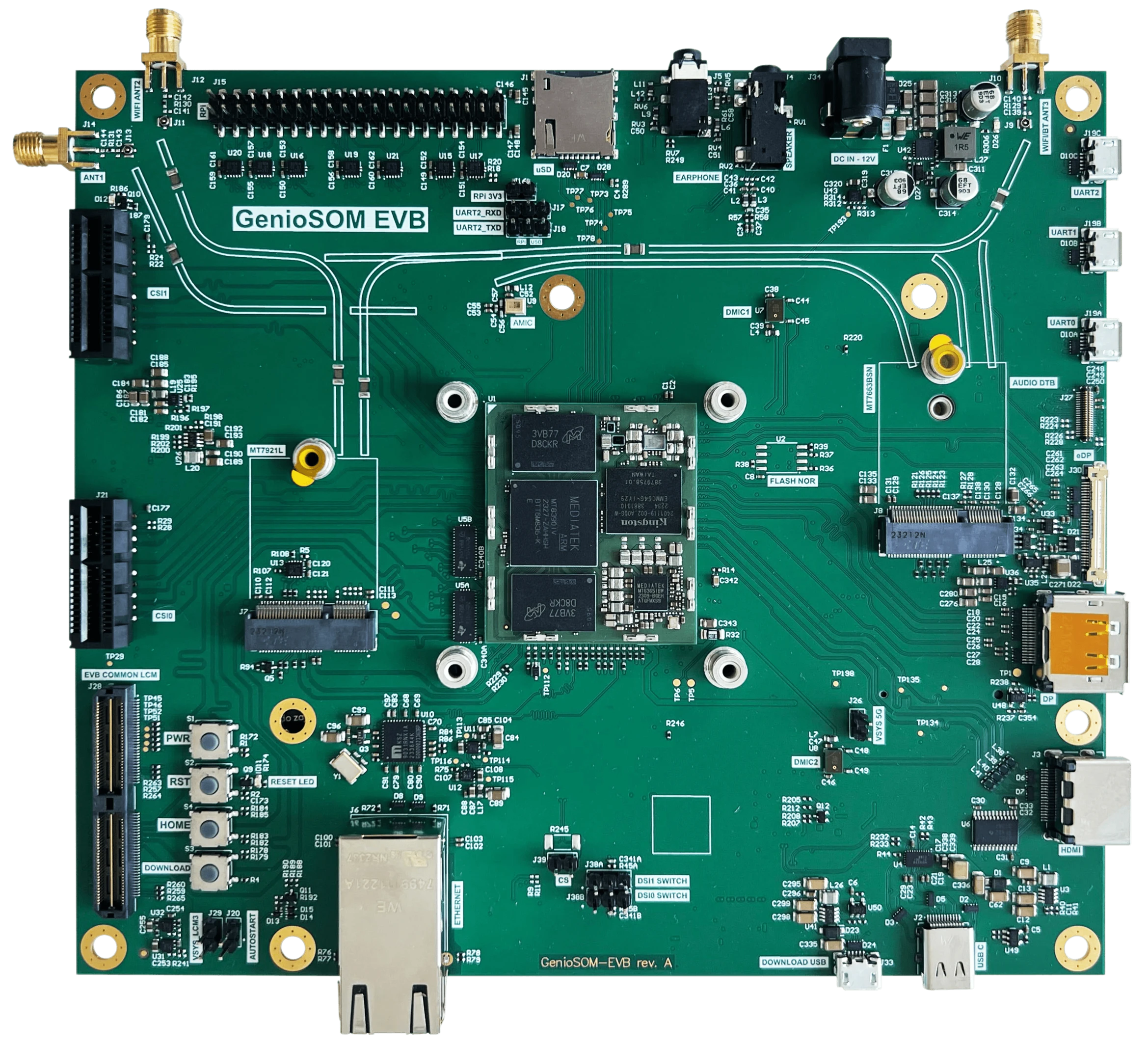 Grinn GenioEVB-700 is a versatile evaluation board built to showcase the capabilities of the Grinn GenioSOM-700 module. With a comprehensive set of peripherals, debugging tools, and connectivity options, it accelerates AI, IoT, and multimedia application development. Its well-thought-out design ensures seamless integration of sensors, displays, and communication modules, simplifying prototyping and reducing time-to-market for new products. The board includes advanced debugging features, Raspberry Pi HAT compatibility, and interfaces for displays, cameras, and wireless communication, making it a perfect reference for developers designing next-generation devices.